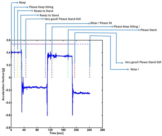 Instrumentation: In this study, we used an Apple Iphone 5 instrument (iPhone 5, Apple Inc., Cupertino, CA, USA) which contains an ultra-compact low-power high-performance 3-axis “nano” MEMS accelerometer, LIS331DLH. The LIS331DLH has user selectable full scales of ±2 g/±4 g/±8 g and it is capable of measuring accelerations with output data rates 0.5 Hz to 1 kHz. It is capable of measuring acceleration data with a data sampling rate of 1000 Hz. It also contains a low-power 3-axis angular rate sensor, L3G4200D. The L3G4200D has a full scale of ±250/±500/±2000 degrees per second and can measure angular rates at a user-selectable bandwidth. An iOS 6-based app, named as “Lockhart Monitor” (App available freely on iOS store) was designed to collect data at a sampling frequency of 50 Hz. The app was programmed in objective C language using Xcode 4 IDE (Integrated Development Environment). The data was collected from inbuilt sensors, accelerometers and gyroscopes in the smartphone and stored in it. The collected data was either transferred using cloud service/Email or by a USB cable to the computer for data analyses. Further data processing was accomplished using custom-made Matlab (MATLAB version 6.5.1, 2003, The MathWorks Inc., Natick, MA, USA) routines. The app was designed after consultations with human factors specialists and clinical requirements from registered nurse specialists. The designed mobile app consisted of a start and stop button and recorded voice instructions were provided through the app with ample rest duration inbetween each performed activity (Table 2). The signals were truncated using the temporal information of voice commands through the app (Figure 1). A portable forceplate (Bertec Corporation, FP4060-05-PT, Columbus, OH, USA) was used to measure postural stability information.
