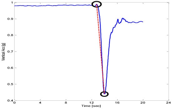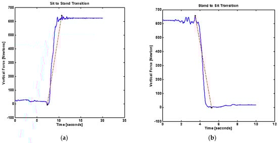 (a) Sit-to-stand vertical force (FV), ∆t is time taken from the minimum vertical force to maximum vertical force and body jerk (slope as dotted red-line); (b) stand-to-sit vertical force (FV), ∆t is time taken from the minimum vertical force to maximum vertical force and associated body jerk (slope as dotted red-line).