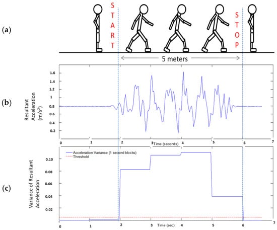 (a) The test starts from still-standing followed by 5 m walk and stops at still-standing as well; (b) resultant acceleration signals (in g-units); (c) moving window (0.5 s) variance of low-pass filtered resultant acceleration.