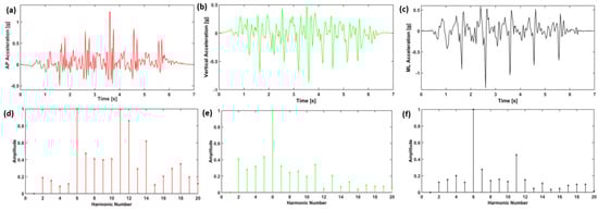 A representative acceleration signal of a patient with (a) acceleration in AP direction; (b) acceleration in vertical direction; (c) acceleration in ML direction; (d) harmonics of AP acceleration; (e) harmonics in vertical acceleration; (f) harmonics in ML acceleration for 5 m walk.