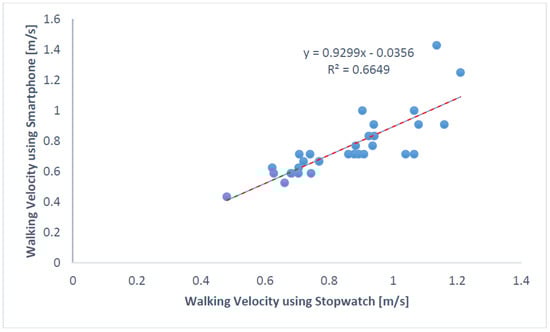 Relationship between the velocities of CVD patients computed from the two systems: stopwatch and smartphone. Dotted-red line shows the regression line.