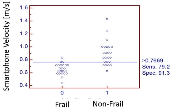 Integrative dot diagram suggesting specificity = 91.3% and Sensitivity = 79.2% for velocity derived from smartphone signals in classification of frail/non-frail patients.