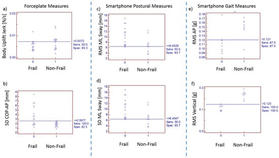 Interactive dot diagram of postural measures from forceplate: (a) Body uplift jerk; (b) SD of COP-AP, postural measures from smartphone; (c) RMS sway-ML; (d) SD of sway-ML and gait measures of smartphone; (e) RMS AP and (f) RMS Vertical.
