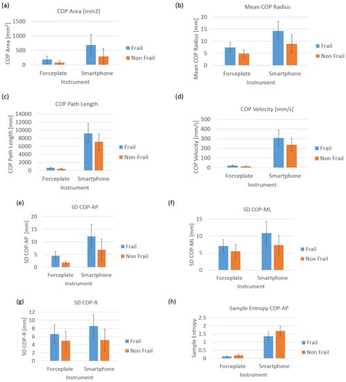 Postural parameters (a) COP Area; (b) Mean COP area; (c) COP path length; (d) COP Velocity; (e) SD of COP-AP; (f) SD of COP-ML; (g) SD of COP-R; (h) Sample Entropy of COP-AP from both systems i.e., forceplate and smartphone.