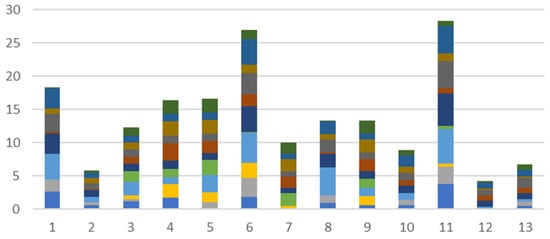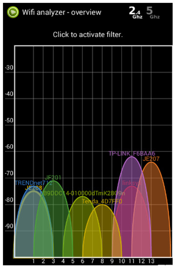 The environment was assessed using Wi-Fi Analyzer application on a smartphone (Figure 6). Typical environmental noise was considered as one with Wi-Fi communications evenly distributed on the specific channels, covering the whole 2.4 GHz spectrum. This seemed to be an appropriate simulation of the real road network, in which unknown communications may occur in every point, without any control (from the sensor network point of view) of the channels used. An example of this environment is presented in Figure 6 in which the channel numbers are represented on the horizontal axis and the signal strength, measured in dBm, on the vertical one.