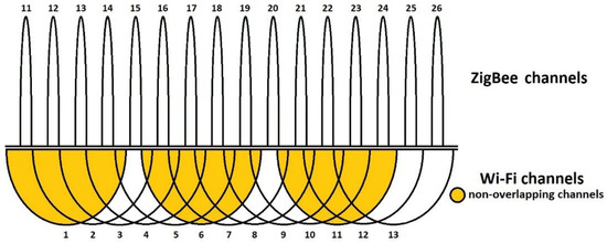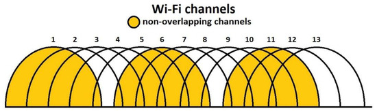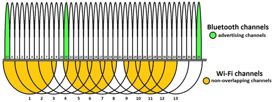 The main influence of this Wi-Fi spectrum is on Bluetooth technology, as it uses three advertising channels and two of them are overlapping Wi-Fi channels 1 and 6 (as detailed in [27] and seen in Figure 4).