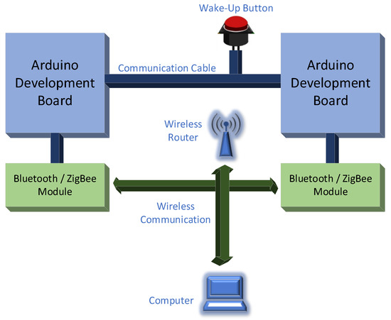 The evaluation started with the test devices put to sleep. An additional wired connection between emitter and receiver was used to signal both modules to wake up. The connection was done as shown in Figure 7.