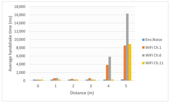 With environmental interference present, which usually can be described as low Wi-Fi traffic, the handshake time has an average value of about 290 milliseconds. From Figure 8 it can be observed that handshake time is not significantly influenced by Wi-Fi traffic on any of the tested channels, if the distance between the modules is small, up to 3 m, the average value being around 380 milliseconds. For greater distances, Wi-Fi channel 6 has the highest influence over the handshake time, but the other channels will affect it too, determining average values which will make this technology difficult to implement if the considered applications will need a free communication environment at all times. The influence of specific Wi-Fi channels (1, 6, 11) occurs due to the initial connection for Bluetooth protocol, that used three advertising channels (presented in Figure 4) that are close to, or even overlap, Wi-Fi channels 1, 6, and 11, respectively. When heavy traffic is induced on these channels, the initial connection between Bluetooth devices is delayed. However, for communications disturbed only by environmental noise (as it would be likely the case in real life), the handshake time remains about the same for all tests.