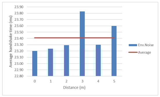 For the Bluetooth technology, handshake time was determined for each considered scenario, the distance between the modules being modified between 0 and 5 m, with 1-m step. Increasing the distance over 5 m led to an increase in handshake time that made this communication technology unsuitable for data exchange between moving devices, in the event of strong interference from the considered Wi-Fi channels. Average measurement values are presented in Table 1 and Figure 8.