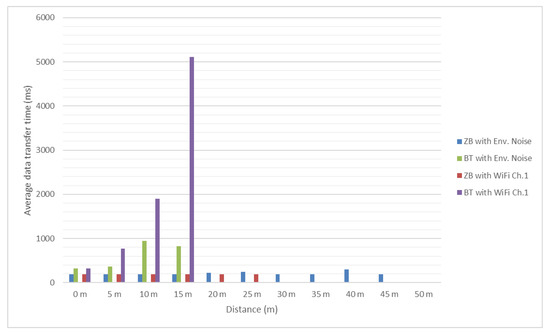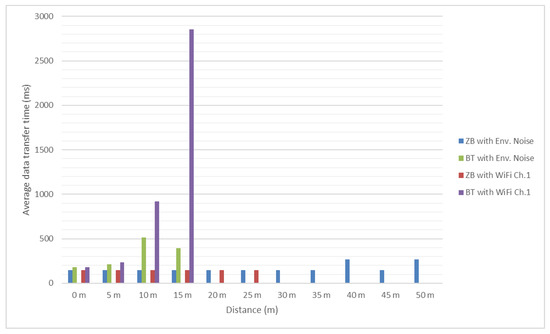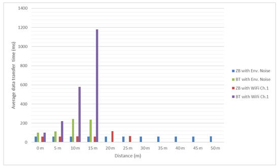 Bluetooth and ZigBee message transfer time (512 bits message/Environmental and Wi-Fi channel 1 interference).