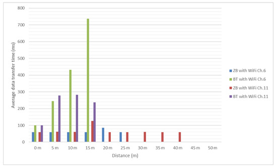 In Figure 12 and Figure 13 it can be noticed that the message transfer time is relatively constant for ZigBee modules with values around 60 milliseconds (this was to be expected due to lack of overlapping between channels) and increasing with the distance for the Bluetooth ones to over 1 s, with channel 1 having the greatest influence. However, even considering this increase, Bluetooth allowed messages to be transferred successfully.