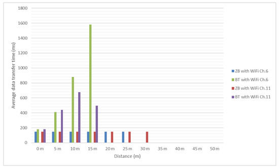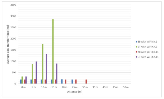 A comparison between Bluetooth and ZigBee handshake time measurements is presented in Figure 10. It can be seen that Bluetooth handshake is faster than the ZigBee’s one for all scenarios with one exception, ZigBee channel 26 which is furthest from Wi-Fi channels. For this channel, the handshake time is ten times smaller than Bluetooth lowest one, and it seems to be the right solution for implementing ZigBee communications.