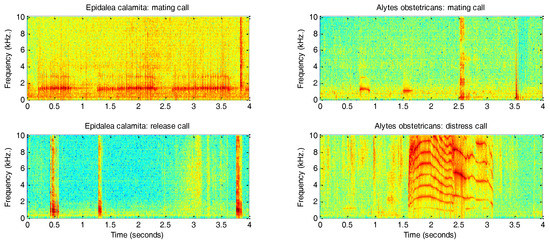 Figure 3 depicts the spectrograms of a sample call for each class. A total of 4343 s (1 h 13 min) of recordings has been analysed, with an average duration of 5 s.
