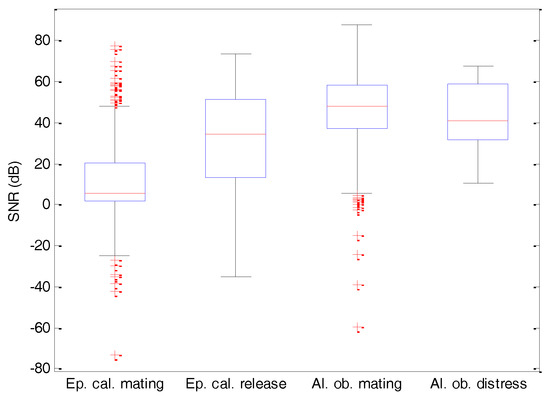 The sounds have been recorded in five different locations (four in Spain and one in Portugal) using a Sennheiser ME80 microphone (Wedemark, Germany), and this issue is discussed in detail in [23]. They are subsequently sampled at 44.1 kHz. A common feature of all the recordings is that they have been taken in their natural habitat, with very significant surrounding noise (wind, water, rain, traffic, voices, etc.), which posed an additional challenge in the classification process. The Signal-to-Noise Ratio (SNR) distribution for each sound class is depicted in Figure 4. The dataset presents an overall SNR median value of 35 dB, although some recordings have a much lower value.