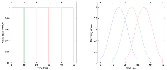 where is the total number of values in the frame. Figure 5 represents a rectangular window function with (left), and a Hamming window with and (right).