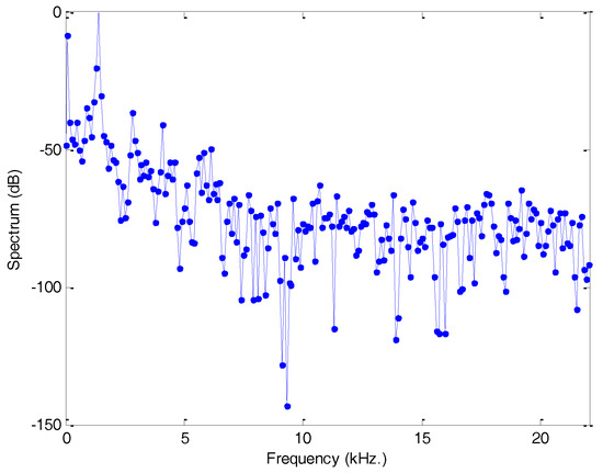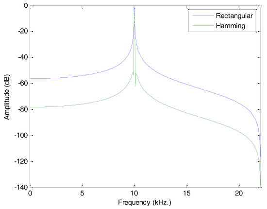 In order to show the effect of framing in the spectrum, a 10 kHz pure tone will be employed. Figure 6 depicts the spectrum obtained when using the simple rectangular function (blue) and the Hamming window (green). In both cases, the spectrum is altered by the framing process, but it can easily be seen that the Hamming window has significantly reduced the impact on the creation of undesired harmonics.