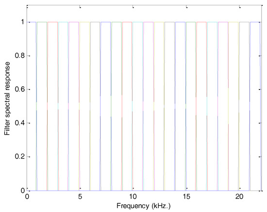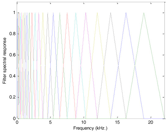 By taking advantage of the mel scale, a bank of mel filters can be designed as one that is composed of filters whose spectral responses are isosceles triangles evenly spaced in the mel scale. In Figure 10, the spectral response of the mel filter bank in conventional scale (frequency) is presented ().
