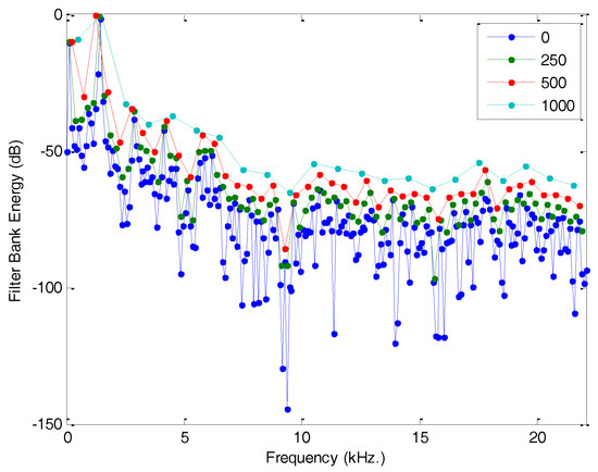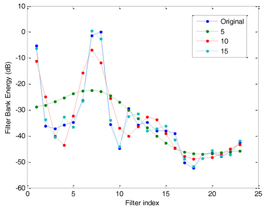 The result of applying a bank of filters to the original spectrum is called the Filter Bank Energy (FBE) and it is defined using only values (usually a figure much smaller than ). Figure 9 reflects the FBE for a bank of rectangular filters with various bandwidths.
