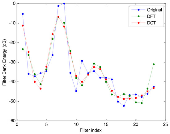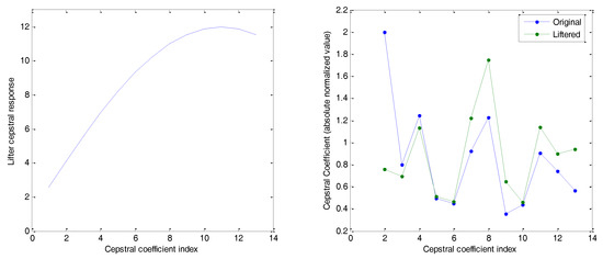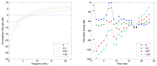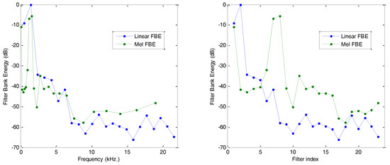 The effect produced by the application of this bank of filters is presented in Figure 11, where it is compared to the result obtained by rectangular filter banks of constant bandwidth (). The effect on the Filter Bank Energy, as can be observed in the frequency scale (left), resembles some kind of equalization with a reduction in the low frequencies and an increase in the high frequencies. However, when the FBE is drawn in comparison to the filter index, then the most noticeable effect (right) is the horizontal rescaling of the spectrum with an expansion in the low frequencies and a compression in the high frequencies.