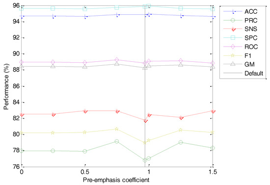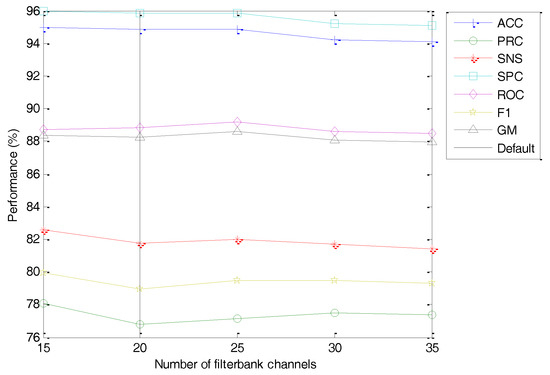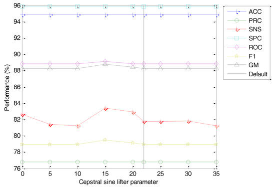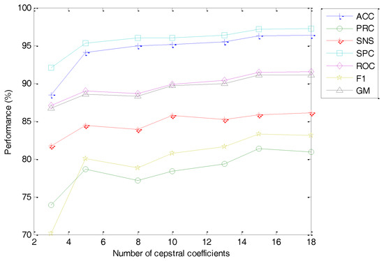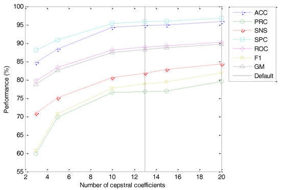 The classification performance metrics of the best classifier vs. the number of optimal cepstral coefficients is depicted in Figure 32. As can be observed, a smaller value of the number of cepstral coefficients () worsens the classifier performance metrics. This effect, however, is limited for a small reduction of , and hence using the default number of cepstral coefficients (instead of the maximum when ) only means a slight reduction in performance (from to ).