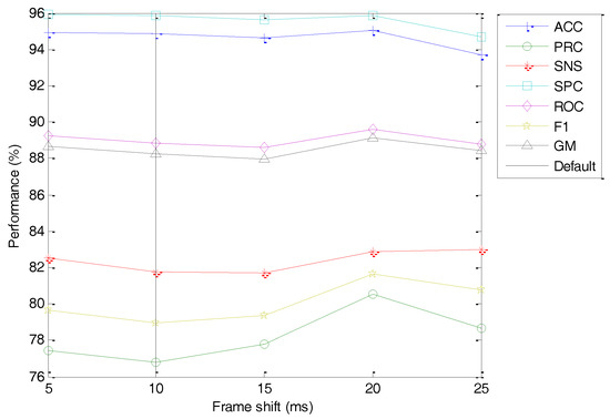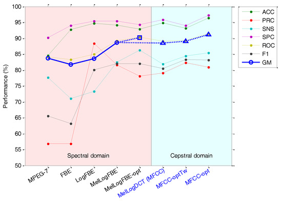 From these results, it can be concluded that using the log scale increases the GM by approximately two points, and using the mel scale raises this value by about five points. On the other hand, the representation of the spectrum in the cepstral domain appears to have no effect on classification performance. However, the GM can be further improved by optimizing the frame duration (with an effect of about 0.5 points) and the range of frequencies with an effect of about two points. The overall effect of the application of the steps from the FBE to the optimum MFCC increases the GM by the amount of more than nine points.