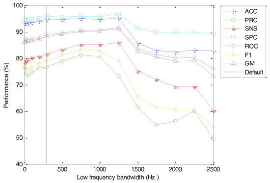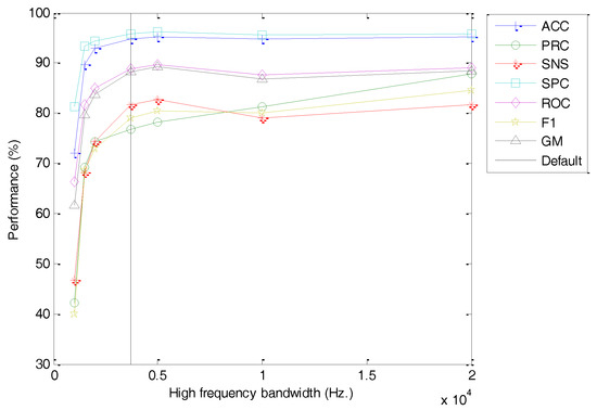 - MFCC with optimum options, that is, extracted with the same options used in the previous stage but now using the optimum values for the limits of low frequency () and high frequency () of the spectrum.