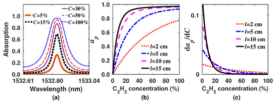 Simulated absorption profiles of for different concentration levels and considering that the laser is scanned from 1532.61–1533.04 nm, where one ro-vibrational line of CH occurs, are shown in Figure 1a. Here, it can be observed that the peak amplitude rapidly increases with the concentration. However, how fast the reaches the maximum value will depend not only on the sample concentration, but also on the gas cell pathlength. For instance, in Figure 1b, the peak amplitude of the absorption for different concentrations and cell lengths is shown. Here, it can be observed that the longer the cell pathlength, the more rapidly the signal peak amplitude will reach one. Besides, as it approaches one, it becomes almost flat for the rest of the concentration range. Consequently, if the concentration is determined based on the peak amplitude, it is possible to optimize the sensor by selecting the gas cell pathlength in order to have either a low and quasi constant sensitivity over the wide concentration region or have a quite large sensitivity for a narrow range of low concentration levels, since after a certain concentration level, the sensitivity will tend to zero (Figure 1c). In this case, the sensitivity was calculated as . Hence, it can be useful to have a different option to analyze and process these absorption profiles, which are the sensor output, to determine the concentration with higher precision, especially in the region where the sensitivity is close to zero. Here, we propose a new algorithm, which helps to conserve the high sensitivity over a much wider dynamic range and also provides a quasi constant sensitivity behavior within this wider range. Additionally, it allows us to have a quasi constant sensitivity over the wide measurement range.