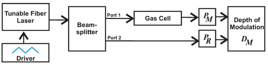 There exist different sensor configurations to perform the sensing based on DA-ATLAS mode. One of these configurations, which is very popular, is that based on dual channels [3,4,5,7,22]. In this configuration, two channels are ideally formed by equally splitting the light beam before it enters the gas cell. In the measurement channel, the beam passes through the gas cell, and at the output, it is recorded by one optical detector. In the reference channel, the beam does not pass by the measurement cell, and therefore, it directly arrives at another detector. In Figure 2 is shown a general block diagram of a dual channel sensing setup. One advantage of this configuration is that the signals of the measurement and the reference channels can be either subtracted, divided or mathematically combined in order to calculate the transmission, the visibility or the depth of modulation (). The is an interesting measurement since it is robust to fluctuations of the light source [23,24], and it can be described as: