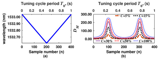 (a) Laser wavelength as a function of time; (b) depth of modulation as a function of time, considering different concentrations of CH and cm.