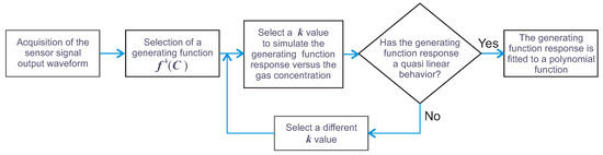 In this form, the gas concentration can be calculated by using the expression , where are the polynomial coefficients and r is the degree of the polynomial (Figure 9a–d). In a practical sensor design, the algorithm should be performed only one time to determine the generating function and its optimal k value. Afterwards, it is only necessary to calculate the generating function based on the sensor output waveform and from this result determine the gas concentration by using the polynomial coefficients. Additionally, the sensitivity for each one of the optimal generating functions is presented in Figure 9e. Here, it can be observed that all of them have an enhanced sensitivity for a higher concentration than obtained with the peak amplitude A of the sensor signal output (). Moreover, from the sensitivity results, it can be observed that and have a larger sensitivity for all the measurement range (0–100%); however, for low concentrations, shows a lower sensitivity than that obtained with . To the contrary, has a high sensitivity to low concentrations similar to that obtained when A is used, but due to the k-moment contribution, it keeps its high sensitivity for the full measurement range. This point demonstrates that the measurement range and the sensitivity of typical gas concentration sensors based on DA-ATLAS can be enhanced by using this kind of tailored algorithm.
