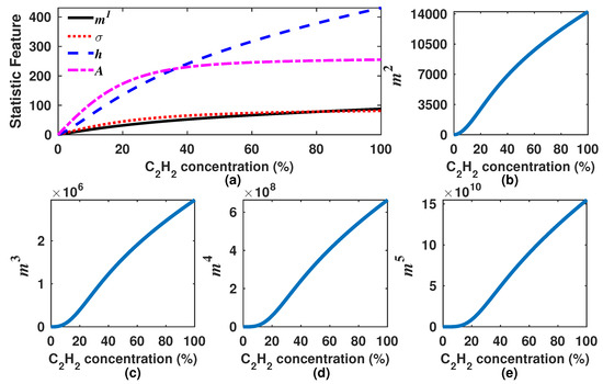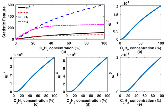 Simulated statistics features of our experimental gas sensor setup. (a) the mean (), the standard deviation (), the entropy (h) and the peak amplitude (A) of are shown; (b–e) some k-th moments over the origin () of are presented