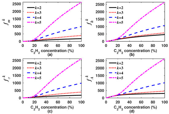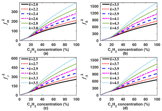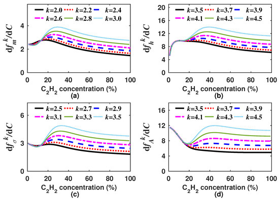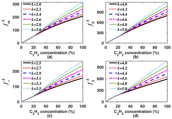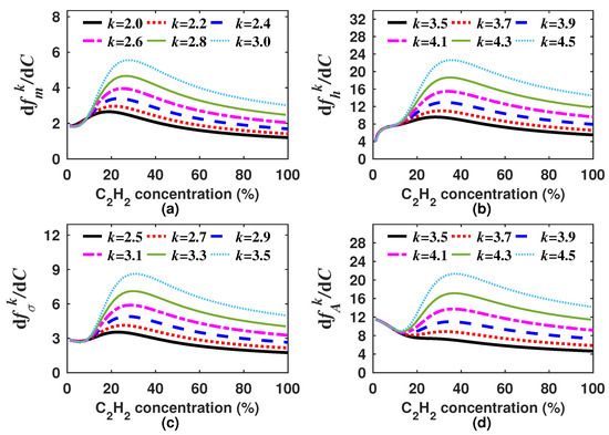 As there are infinite possible k values, it is necessary to select only one for each generating function (Equations (8)–(11)). In our case, we decided to look for the k values for which the built generating functions have a quasi linear response to the concentration. Moreover, in general terms, the sensitivity can be calculated as the derivative of the generating function with respect to the gas concentration . Since we are looking for functions with quasi linear response to the concentration (Figure 7), therefore the sensitivity must have a quasi constant behavior within the measurement range. It is important to point out that the k value will not necessarily be the same for each generating function. For instance, for our design example, we found that the optimal k was within the range of 2.0–3.0, 3.5–4.5, 2.5–3.5 and 3.5–4.5 for , , and , respectively. In Figure 7 and Figure 8, the generating functions () for these k intervals, in steps of 0.2, and their corresponding sensitivities are shown, respectively. From Figure 8, it can be observed that the sensitivity of the four generating functions is improved with these k values since these are now much larger than zero and have a quasi constant profile for high concentrations. This shows that by using these algorithms, it is possible to enhance the sensitivity for higher concentrations, which is not possible when the concentration is determined based only on either the peak amplitude, the mean, the RMS or the standard deviation. After we find a range of k values for which the generation functions have a quasi linear behavior, just one of these k values must be selected for each function. For our example, we determined as the optimum k value 2.2, 4.2, 2.9 and 4.1 for , , and , respectively. In Figure 9a–d, it can be appreciated that each optimal generating function has a very linear behavior compared to that obtained when the A, , or h are computed (Figure 5a). Moreover, these functions present some inflection points due to the combination of different functions and can be precisely fitted with a polynomial.