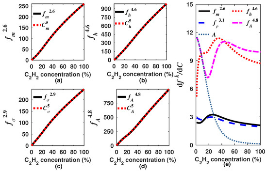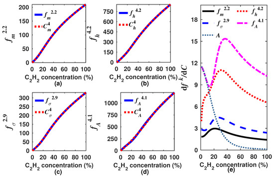 Once the signal was simulated, we proceeded to calculate the generating functions and to look for the optimal k value that provided the most constant sensitivity for each one. Firstly, the , h, and A statistics features were calculated (Figure 12). Afterwards, based on Equations (8)–(11), the generating functions were calculated for some k values for which these functions provide the most constant sensitivity over a wider dynamic range. In Figure 13, some examples of functions obtained with some particular values of k are shown. Moreover, the sensitivity that can be achieved by using these functions is shown in Figure 14. Afterwards, we proceeded to select one k value for each generating function of this experimental case, which were 2.6, 4.6, 2.6 and 4.8 for , , and , respectively (Figure 15). Moreover, their sensitivities are shown in Figure 14e. From this figure, it can be observed that and have a greater sensitivity for high CH concentrations and also that the function has a greater sensitivity for low concentration levels. Therefore, we considered that is the best option to be used for this gas sensor design since it has a larger concentration over the full concentration range. Finally, these optimal generating functions were fitted with a polynomial of the form to determine the concentration, and the constants are listed in Table 1.