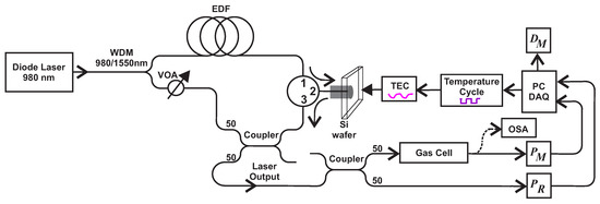- Gallegos-Arellano, E.; Vargas-Rodriguez, E.; Guzman-Chavez, A.D.; Cano-Contreras, M.; Cruz, J.L.; Raja-Ibrahim, R.K. Finely tunable laser based on a bulk silicon wafer for gas sensing applications. Laser Phys. Lett. 2016, 13, 065102. [Google Scholar] [CrossRef]