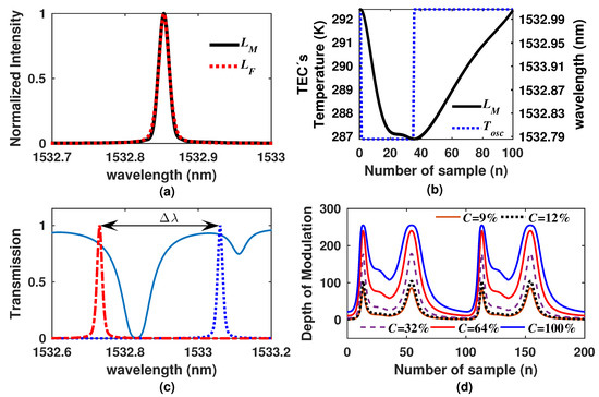where and . Moreover, by varying the TEC’s temperature from 287.9–292.0 K, it was possible to tune the laser emission from 1532.785–1533.000 nm , as shown in (Figure 11b). Here, the laser line wavelength is scanned periodically over time. In our case, we developed a PID controller to drive the TEC’s voltage supply and to guarantee that the temperature remains over the wavelength scanning range. In this case, we did not optimize the PID in order to drive the TEC’s temperature with a linear behavior as when it is driven with sawtooth or triangular waveforms (Figure 3). In our TEC’s PID controller software program, we set the levels of temperature , and the laser emission was tuned following the function shown in Figure 11b. Moreover, by varying in this way the temperature of the Si wafer, the laser line was scanned almost completely over the ro-vibrational absorption line, as can be observed in Figure 11c. Finally, by using the simulated laser line emission and its tuning characterization, the for different concentrations was simulated, and the results are shown in Figure 11d; here, waveforms were normalized to 255.