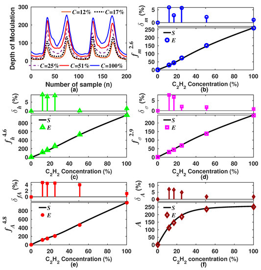 Now, in order to support our simulated results, we performed some measurements with different CH concentrations. The measured waveforms for each concentration are shown in Figure 16a (see Table 1). Afterwards, for each one of these signals, the optimal generating functions , , and were calculated.