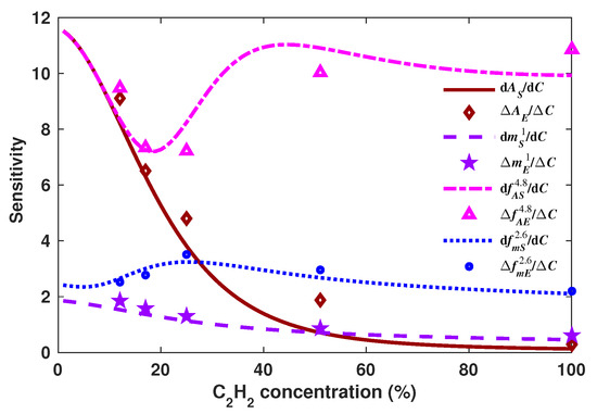 One of the main points of the algorithm is to enhance the sensitivity over a larger dynamic range. As an example, the sensitivity obtained based on a single statistics feature (peak amplitude and mean) and that obtained with some generating functions ( and ) are shown in Figure 17. For this case, the approximate sensitivity values for the experimental measurements E were calculated by using the relationship . From Figure 17, it can be noted that the tailored functions provide a better sensitivity level over a much wider dynamic range. For instance, has a similar sensitivity to that of A within the concentration range from 0–17%, but after this level, the sensitivity obtained with the generating function is considerably larger. Similar behavior is observed when the sensitivity is obtained with the and functions. Thus, it can be concluded that generating functions can be suitable to keep a high sensitivity over a larger dynamic range compared with that obtained when it is determined based on a single statistics feature, such as the peak amplitude, the mean, the area or the RMS. Furthermore, of our tailored functions, was the best option since it has the highest sensitivity for low concentration levels, and it is kept quasi constant for the full measurement range.