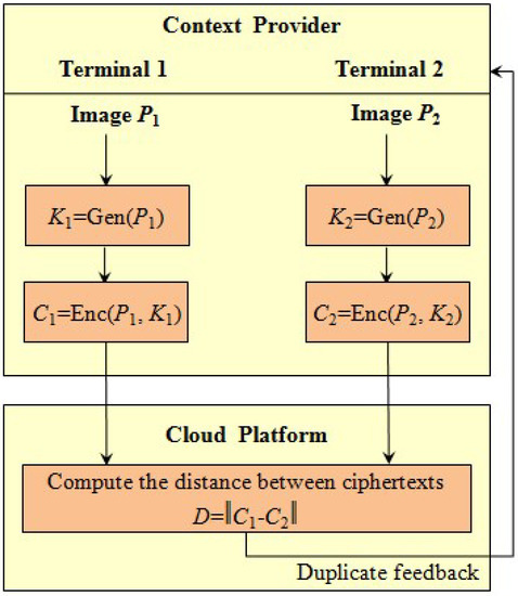 In file-level deduplication, the files are identified as duplicated copies if every pixel of exactly matches. Using this context, the operation of pixel comparison with privacy preservation based on the convergent encryption is achieved. As illustrated in Figure 1, the deduplication system involves the context providers and the cloud platform in IoT scenarios. In the terminal sides, the collection of contexts is conducted. Meanwhile, the terminals take charge of image encryption before transmission. In the cloud platform, the obtained ciphertexts are stored in the server and the deduplication is conducted in the encrypted form. The following steps describe the procedures of the privacy-preserving file-level deduplication scheme.