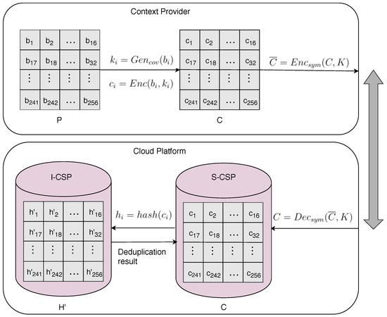 In this subsection, a block-level deduplication system based on the convergent encryption is described. The system aims to achieve two main goals. On one hand, the deduplication work will be conducted on blocks of images, which can reach a much higher deduplication ratio. On the other hand, to protect users’ private information, the data must be encrypted before being transmitted onto public channels to avoid eavesdropping. Meanwhile, the original information is unknown to the data center if the task of deduplication is finished in the encrypted form. Figure 2 shows the block-level deduplication system.