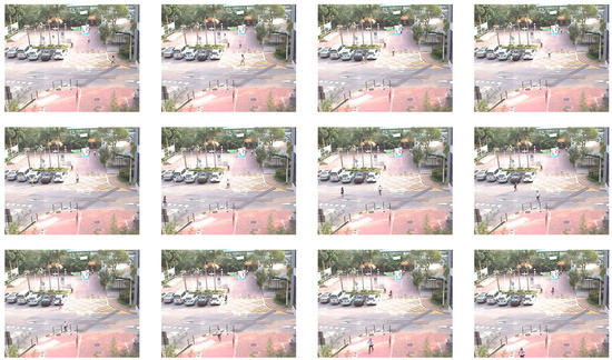 All of the experiments were performed on computer with Intel (R) Core(TM) i7-7500U CPU 2.7GHZ with 8G RAM. As shown in Figure 5, a series of continuous frames were extracted from a traffic video sequence recorded by a stationary camera, which is supported by [43]. Each frame was resized to and divided into 256 blocks of size . The proposed system was implemented as described in Section 4, and its performance was evaluated.