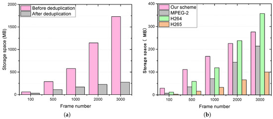 As for the ratio of deduplication, the deduplication scheme was applied on the video and the results from 100 to 3000 frames are reported in Table 1. The ratio of deduplication increased to 84.04% when the number of frames reached 3000, which means that the overall compression ratio for the images yielded a space saving of 84.04%. So, the requirement for storage space for these 3000 frames was only about 16% of the required storage space before deduplication. Figure 6a illustrates the comparison of storage space between the original video and the video after deduplication. It can be seen that with an increase in frame number, the deduplication ratio increased rapidly; thus, the proposed system can greatly reduce storage space.