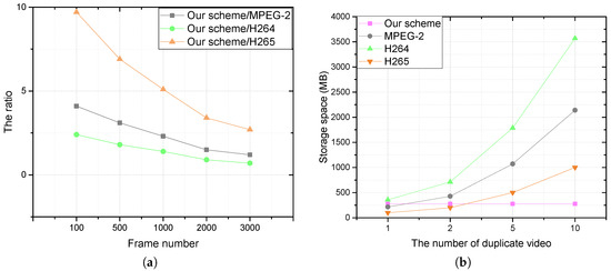 (a) The ratio of the proposed scheme to compression algorithms; (b) comparison of storage space between the proposed system and compression algorithms when a video is duplicated.