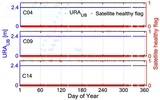 Satellite-health status has specific markers in the broadcast ephemeris, however, if there is any sudden and unexpected failure, the Operational Control Segment (OCS) will guarantee a failure warning in the next broadcast ephemeris. This is insufficient for the users of BDS. Traditional SIS anomalies are monitored on the basis of the relationship between SIS UREs and URA as follows: if the SIS UREs are greater than , it can be determined that the satellite service is not guaranteed [12]. However, the URA index in BDS broadcast ephemeris is not equivalent to that of GPS [17]. Figure 1 shows the time series of and satellite healthy flag (0: health, 1: anomaly) from BDS broadcast ephemeris for the C04, C09 and C14 during the year 2017. The remains constant even if the satellites fail. In this case, a prior model of the SIS UREs of each satellite can be obtained through analysing the SIS UREs for a period of time from the selected tracking stations. Then, the thresholds of SIS UREs can be determined using the prior model and confidence level, instead of the URA. The specific processes are as follows: