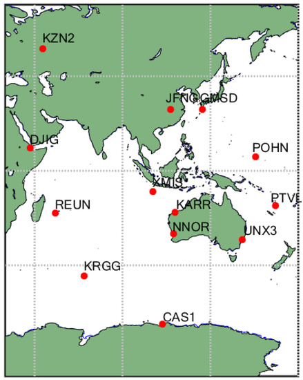 In order to verify the reliability of the BDSGSISM, the BDS observation data from MGEX of International GNSS Service (IGS) for the years 2015 and 2017 have been used. As BDS mainly serves the Asia-pacific region, we selected 13 stations over the region and the nearby area as the experimental data sources. The specific information of these tracking stations including the tracking-station name, the receiver type, the antenna type and the BDS satellite is summarized in Table 1 and the distribution is shown in Figure 2.