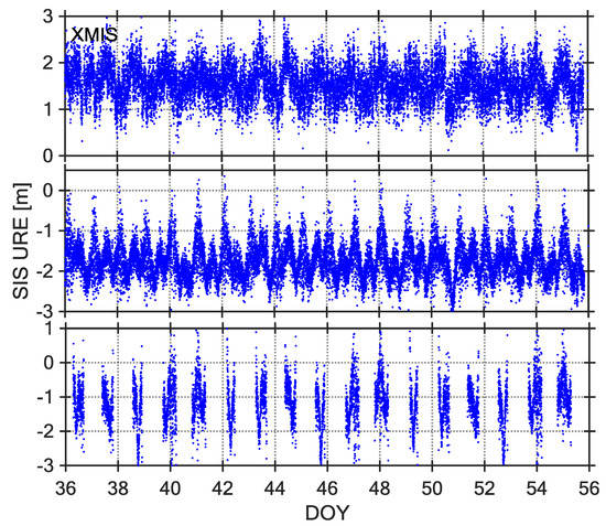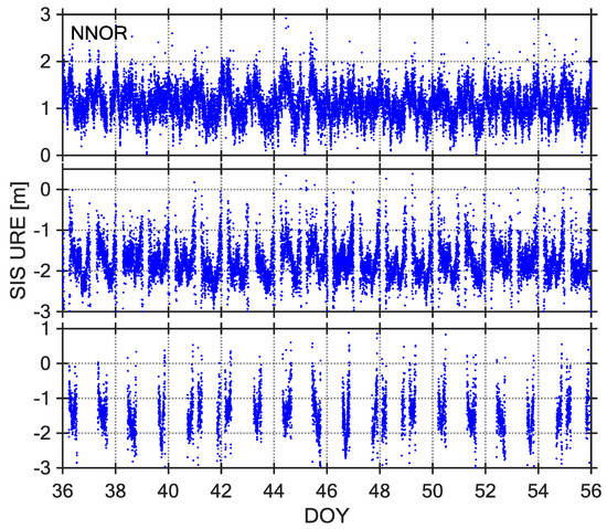 Observations from 21-day intervals of DOY 036–056, 2017 were selected as the core data sets for studying BDS SIS UREs. The Figure 3, Figure 4 and Figure 5 show three types of URE time series (C04, C09, and C14) observed by three stations (NNOR, XMIS, and GMSD) with different latitudes. According to the time series of SIS UREs, which are very similar across all stations, there are obvious characteristics: the time series of C04 and C09 are dominated by some sinusoidal waves, however, the time series of C14 are not continuous because the satellite cannot be continuously observed by tracking stations. According to a comparison between broadcast ephemeris data and precise ephemeris product, the broadcast orbit errors exit significant periodic fluctuation in radial, along, and cross direction [7]. Therefore, the fluctuations of SIS UREs are mainly caused by the broadcast orbit errors.
