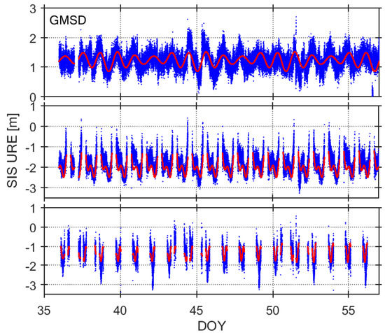 Examples of SIS-URE time series of Station GMSD, C04 (top), C09 (middle) and C14 (bottom), DOY 036–056, 2017, SIS UREs (blue) and Fourier models (red) on B1 band.