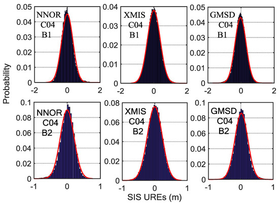 The histograms of C04 SIS UREs (m) after eliminating the trend term covering fourteen experimental days, overlaid with empirical normal probability-density function (PDF) curves (in red). Six subplots, arranged in two rows and three columns, show the results for three tracking stations (left column, NNOR; middle column, XMIS; right column, GMSD) and two frequencies (upper row, band; bottom row, band).