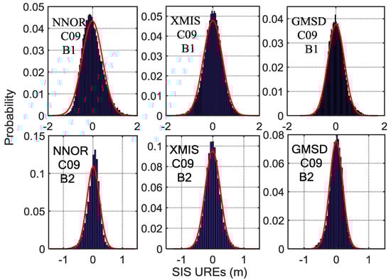 The histograms of C09 SIS UREs (m) after eliminating the trend term covering fourteen experimental days, overlaid with empirical normal probability-density function (PDF) curves (in red). Six subplots, arranged in two rows and three columns, show the results for three tracking stations (left column, NNOR; middle column, XMIS; right column, GMSD) and two frequencies (upper row, band; bottom row, band).