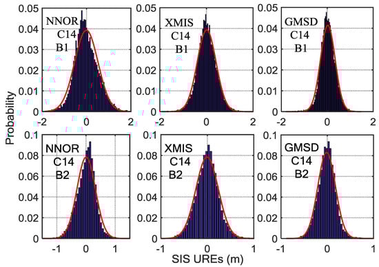 The histograms of C14 SIS UREs (m) after eliminating the trend term covering 14 experimental days, overlaid with empirical normal probability-density function (PDF) curves (in red). Six subplots, arranged in two rows and three columns, show the results for three tracking stations (left column, NNOR; middle column, XMIS; right column, GMSD) and two frequencies (upper row, band; bottom row, band).