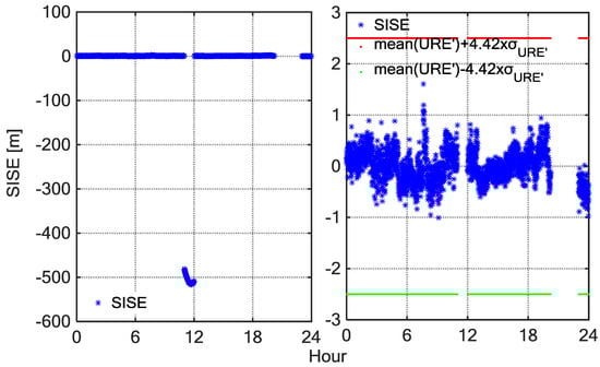 The study of monitoring SIS anomalies has long been conducted for Global Positioning System (GPS) [10,11,12,13,14], however, few studies have focused on BDS. Present detecting methods mainly depend on the relationship between User Range Accuracy (URA) in the broadcast navigation messages and URE to monitor SIS condition [6,13,14]. The URA is a conservative representation of the standard deviation of URE at the worst cast location on the earth [15]. In the case of GPS, the SPS SIS standard assures that the URE should be less than 4.42 times the upper bound on the URA value () for any healthy SIS during normal operation [16]. However, according to statistical analysis of BDS navigation messages for a long time, it showed that the BDS URA index values were constant, even in the case of satellite failure [17]. In the case of BDS, the specific definitions of the signal in SIS accuracy index parameters of broadcast navigation messages are not published in the current ICDs [18]. Therefore, the URA of BDS is unsuitable to construct a threshold to monitor the BDS SIS anomaly. Besides, the empirical values are also used as thresholds to detect BDS anomalies [19]. However, some error sources, such as multipath effect and receiver noise, are also closely related to monitoring stations, so the random model based on general hypothesis has defects that may result in false detection and false alarm in the practice use. In those cases, knowledge of characteristics of the BDS SIS URE has a great importance for monitoring the SIS anomalies.